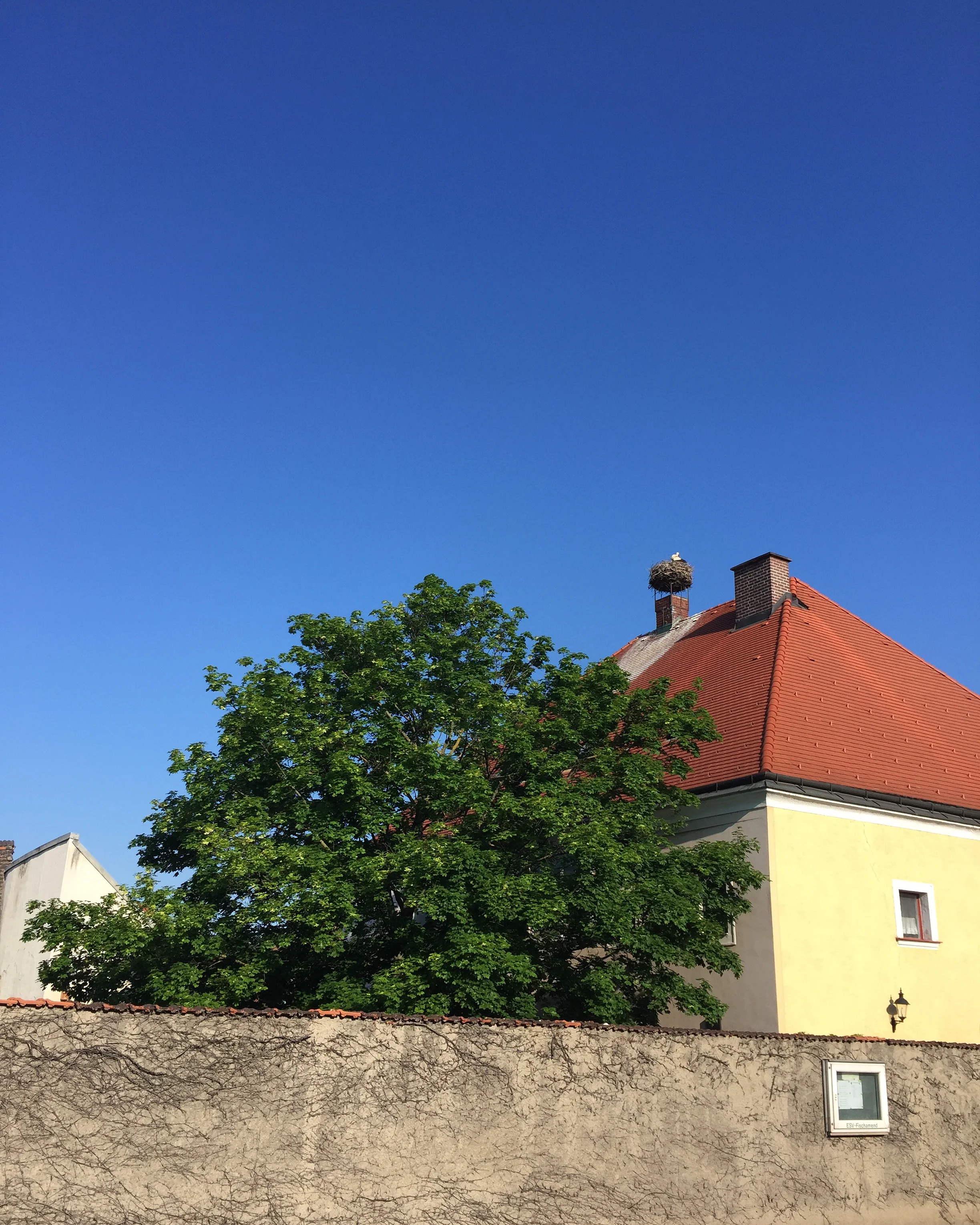 I almost jumped for joy on seeing my first white stork, nestled neatly on a chimney. A little illustration of the bird appears on each chapter head in A Time of Gifts, and I’d been longing to catch sight of one. I’d only ever seen them depicted on greeting cards but had read wonderful stories about towns and villages welcoming back their storks each year. The birds winter in Africa and then return to Europe each April to breed.